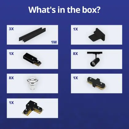 Beschreibung Komplettset 1-Phasen Rail L 1 x 2 Meter Schwarz | incl. 8x Spot + GU10 2700K 3W Dimmbar + Abschlusskappe, Stromanschluss und L -Verbinder