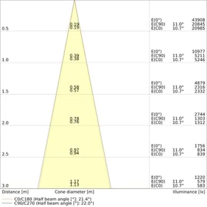 Beispiel: Wird eine Lampe mit einem Abstrahlwinkel von 60 Grad an der Decke (2,5 m Höhe) angebracht, erzeugt sie einen Lichtkegel von 2,9 Metern Durchmesser. Hat die Lampe hingegen einen Abstrahlwinkel von 120 Grad, beträgt der Lichtkegel 8,7 Meter im Durchmesser. |