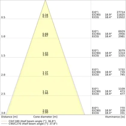 Beispiel: Wird eine Lampe mit einem Abstrahlwinkel von 60 Grad an der Decke (2,5 m Höhe) angebracht, erzeugt sie einen Lichtkegel von 2,9 Metern Durchmesser. Hat die Lampe hingegen einen Abstrahlwinkel von 120 Grad, beträgt der Lichtkegel 8,7 Meter im Durchmesser. |