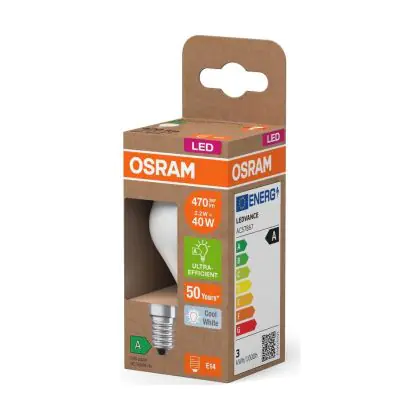 Die Osram LED Classic LED E14 Birne Fadenlampe Matt 2.2W 470lm - 840 Kaltweiß | Ersatz Für 40W ist eine effiziente E14 LED-Lampe mit Retrodesign und der perfekte Ersatz für Ihre konventionellen 40W Lampen mit E14. Zudem strahlt sie Licht in der Farbtemperatur 4000K - Kaltweiß aus und punktet durch eine lange Lebensdauer.