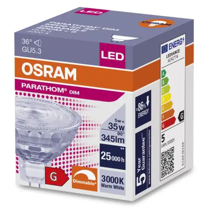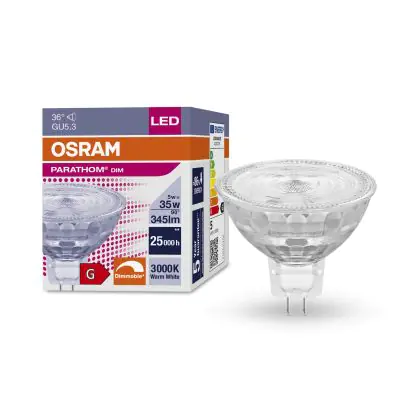 Die Osram Parathom LED GU5.3 Spot Klar 5W 345lm - 930 Warmweiß | Dimmbar - Höchste Farbwiedergabe - Ersatz für 35W ist eine effiziente GU5.3 LED-Lampe und der perfekte Ersatz für Ihre konventionelle Halogenlampe mit 35W und einem GU5.3-Sockel, bei dem die beiden Stifte einen Abstand von 5,3 mm zueinander haben. Die Abkürzung MR16 zeigt Ihnen, dass der Reflektor einen Durchmesser von 5 cm hat. Zudem strahlt das Produkt Licht in der Farbtemperatur 3000K - Warmweiß aus und punktet durch eine lange Lebensdauer.