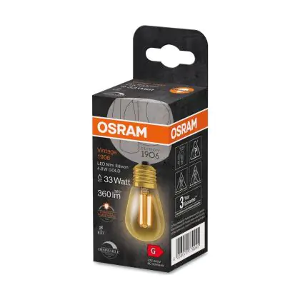 Die Osram Vintage 1906 LED E27 Edison Fadenlampe Gold 4.8W 360lm - 822 Extra Warmweiß | Dimmbar - Ersatz Für 40W ist eine effiziente E27 LED-Lampe mit Retrodesign und der perfekte Ersatz für Ihre konventionellen 40W Lampen mit E27. Zudem strahlt sie Licht in der Farbtemperatur 2200K - Extra Warmweiß aus und punktet durch eine lange Lebensdauer.