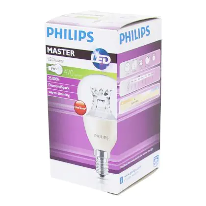 Die Philips LEDluster E14 ist eine moderne LED-Lampe. Sie verfügt über einen E14-Sockel und dient als Ersatz für herkömmliche Leuchtmittel von 40 Watt. Mit einem Energieverbrauch von nur 6 Watt ermöglicht sie eine Stromeinsparung von ca. 85%. Als Produkt der DimTone-Serie ist sie dimmbar und kann in ihrer Farbtemperatur auf einer Skala von 2.200 bis 2.700 Kelvin verändert werden.