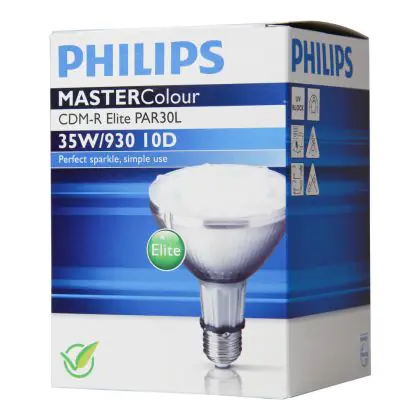 Die Philips CDM-R Elite 35W 930 E27 PAR30L 30D (MASTERColour) Lampen haben den Vorteil einer hohen Lichtqualiät und einen Farbwiedergabeindex von 90-100Ra. Das Licht ist warmweiß (3000K).